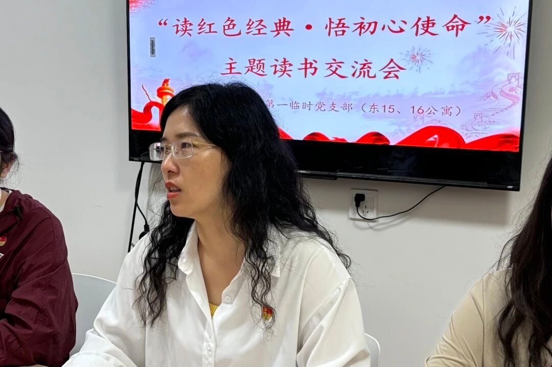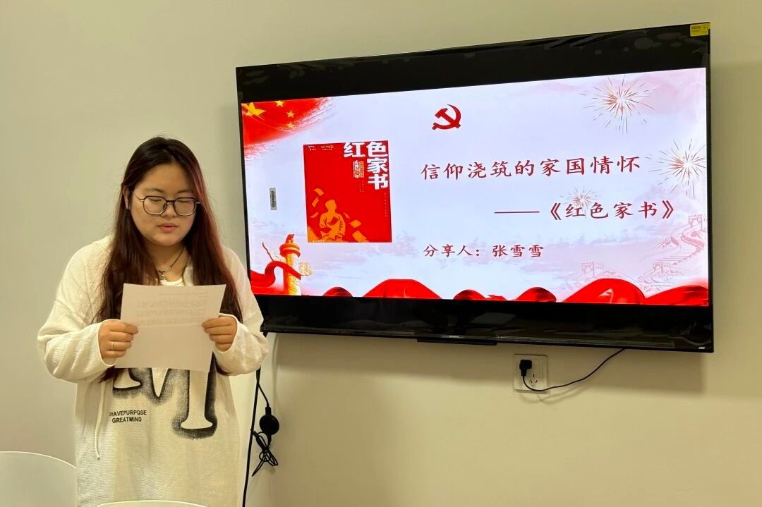 张雪雪同志围绕“信仰浇筑的家国情怀”,对《红色家书》进行分享。她通过解读家书中革命先辈们对家人的深情与对国家的担当,展现了他们以信仰为基,将个人命运与家国命运紧密相连的深厚家国情怀,使在场党员深受触动。