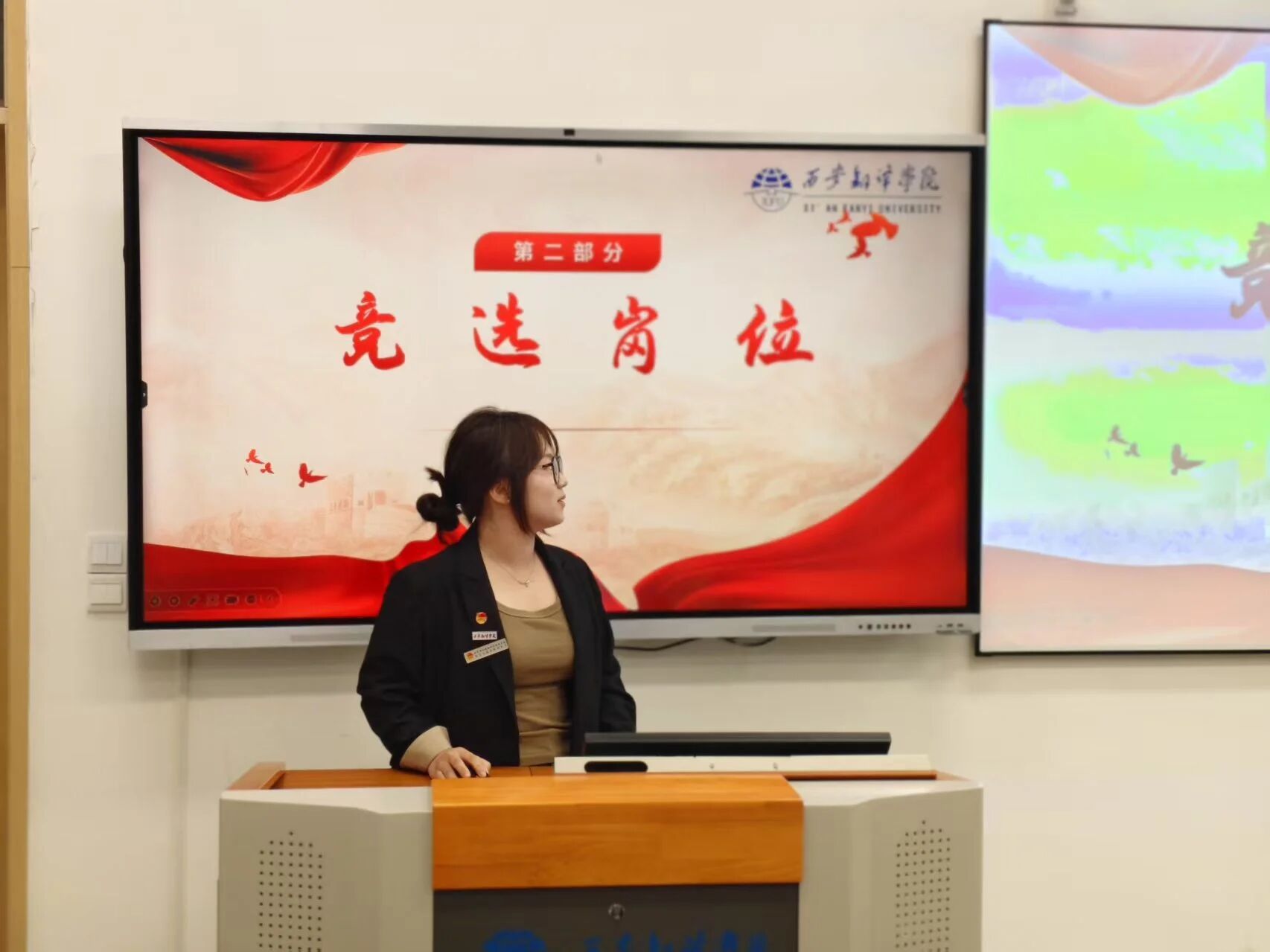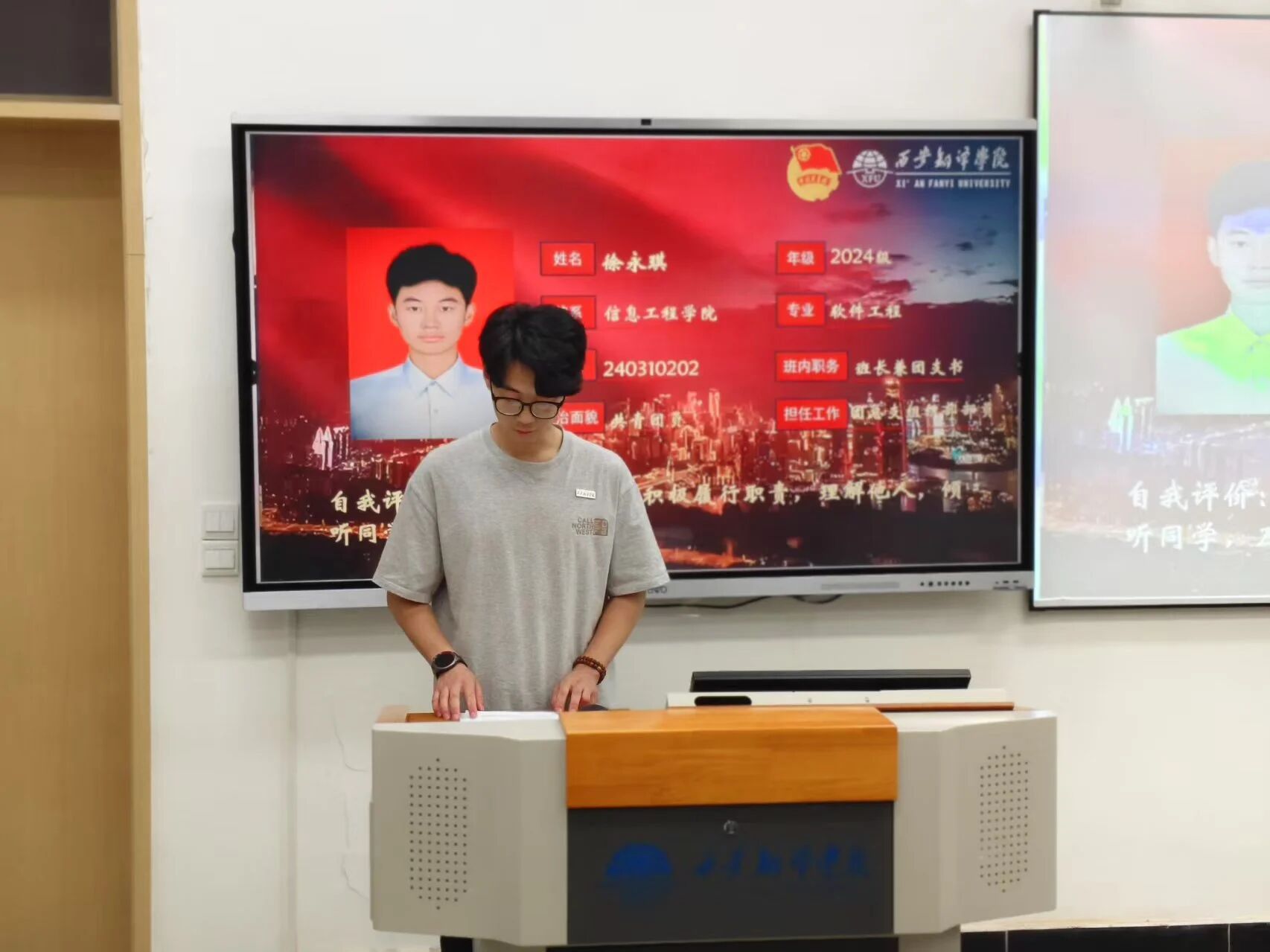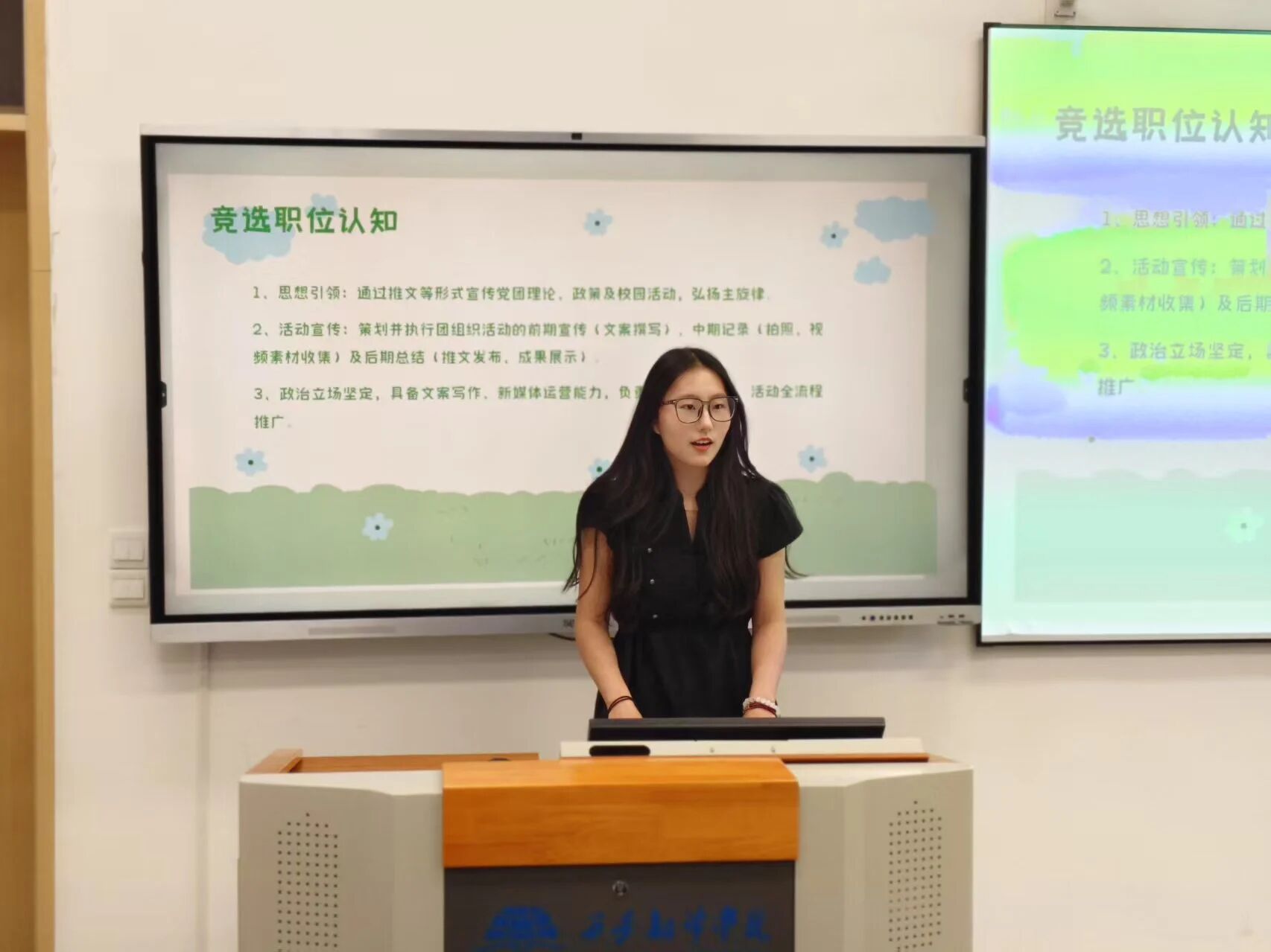 本次答辩会通过个人陈述、现场问答等环节,全面展现候选干部的综合素质,为学院学生工作队伍的梯队建设奠定了坚实基础。参与答辩的同学们按顺序上台展示。他们以充分的准备、昂扬的精神面貌和从容的自信,从个人履职情况、岗位认知、发展规划三个维度进行了全面陈述。