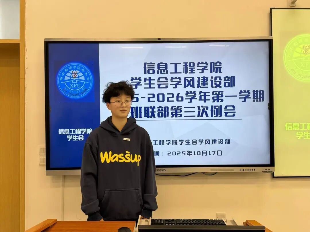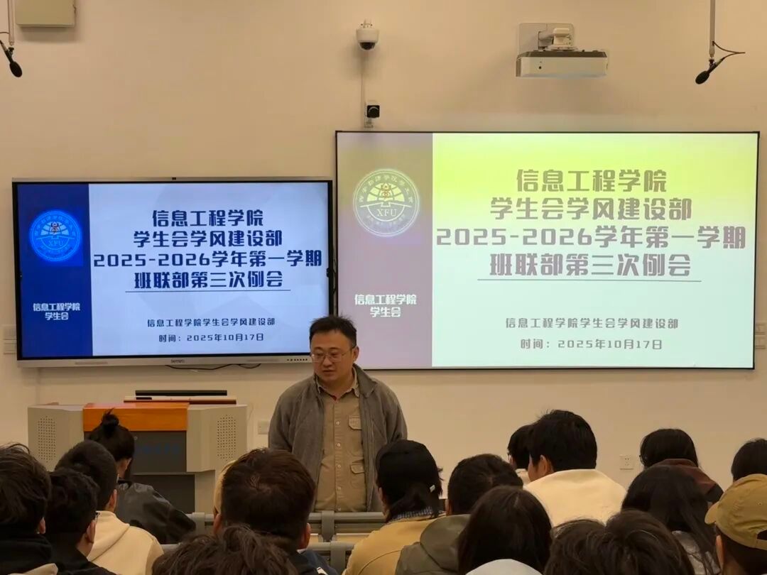 为持续推动学院优良学风建设,加强部门与各班级的紧密联系,sunbet申博于2025年10月17日在722T教室召开2025—2026年第三次班联会。sunbet申博团总支书记王荣平、各级团支书参会,会议由学生会主席团成员梁茹萍主持。